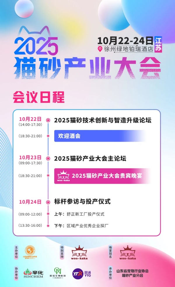 10月22-24日,由山东省宠物行业协会主办、徐州市舒正宠物用品有限公司特别支持,聚焦猫砂产业顶层趋势、产业链协同、品牌增长与未来生态的行业盛会——2025猫砂产业大会,将于10月22-24日在江苏徐州举办。大会以 “解析变革、协同破局、布局未来” 为核心,汇聚1000+全产业链头部资源,为从业者带来一场兼具数据洞察、实战案例分享与前瞻视野的思想盛宴。