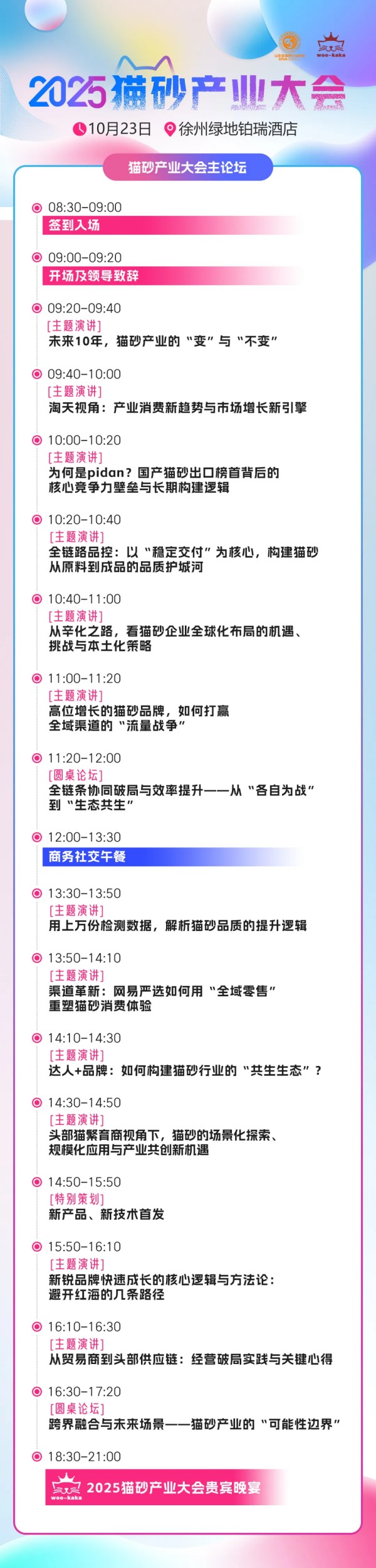 2025 猫砂产业大会,不仅是一场聚焦行业前沿的趋势解读会,更是串联猫砂全产业链的资源对接核心枢纽、激发产业创新的思想交锋高地、促成多方携手的合作共赢平台。