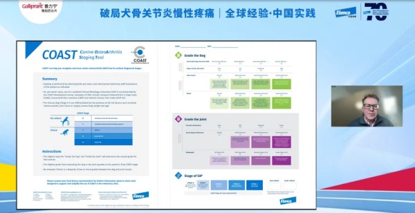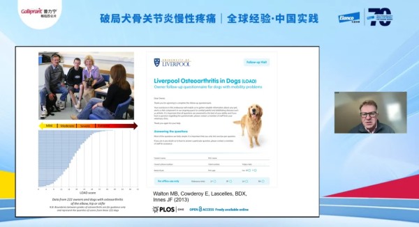 会议首先由英国皇家兽医外科学院院士 John Innes 教授带来主题演讲。他指出,识别难、干预晚,是犬OA治疗失败的重要原因之一。因此,他介绍了两项关键工具:利物浦犬骨关节炎问卷(LOAD,Liverpool Osteoarthritis in Dogs),通过宠主对狗狗的活动能力和行为反馈量化疼痛表现;以及犬骨关节炎分期工具(COAST,Canine Osteoarthritis Staging Tool),用于标准化临床分期与管理。前者通过宠主参与OA评估,帮助医生更早识别病情,后者为治疗提供分层依据,二者共同为构建科学、可追踪的OA诊疗体系奠定基础。
