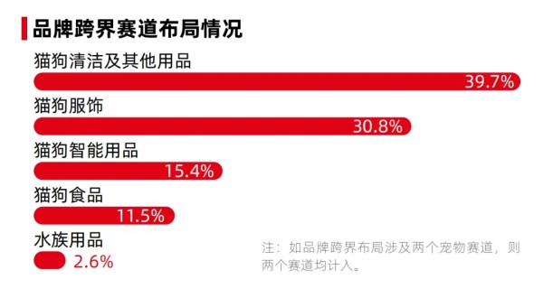 在品牌跨界布局的宠物赛道中,“猫狗清洁及其他用品” 以39.7%的占比高居首位,显示出宠物日常护理市场的巨大需求。其次是“猫狗服饰”(30.8%)和“猫狗智能用品”(15.4%)。猫狗食品占比11.5%,水族用品仅占2.6%。