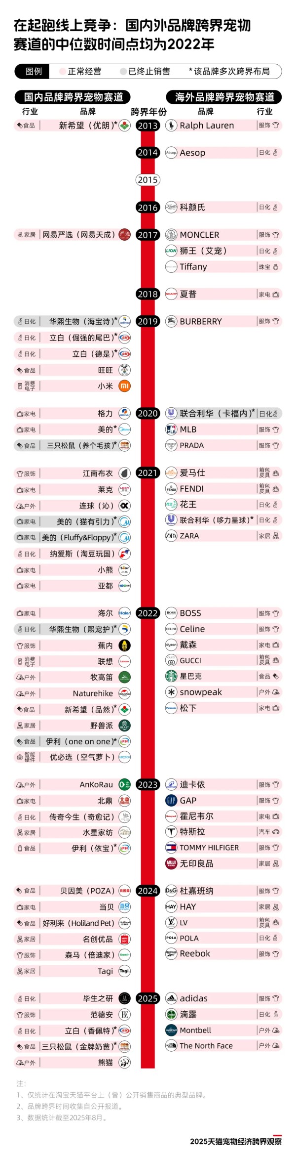 报告指出,无论是国内还是海外品牌,跨界宠物赛道的中位数时间点均为2022年。这一年也被视为宠物经济跨界布局的“起跑线”。在此之前,已有部分品牌如新希望(优朗)、网易严选(网易天成)等提前布局,但2022年后明显加速。