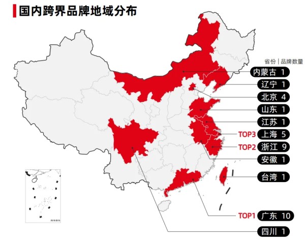 从地域分布来看,国内跨界宠物品牌主要集中在经济发达地区。广东以10个品牌位居全国第一,浙江9个,上海5个,三地合计占比超过六成。这些地区不仅消费市场成熟,供应链资源丰富,也具备较强的品牌运营与市场响应能力。