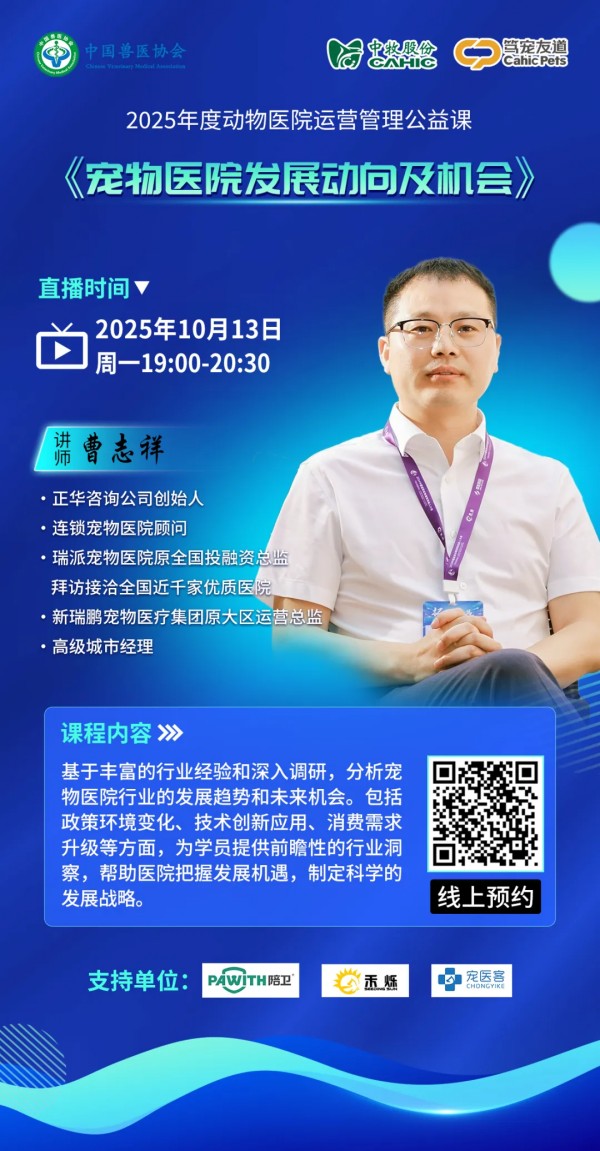 近年来,中国宠物市场规模持续扩大,2024年已突破3000亿元,动物医院作为宠物医疗服务的核心载体,数量呈爆发式增长。然而,行业快速发展的同时,也暴露出诸多问题:多数动物医院缺乏科学的运营管理体系,在营销推广上手段单一,难以吸引客户;服务流程不规范,导致客户流失严重;内部管理粗放,成本居高不下;战略定位模糊,制约了长远发展。 中国兽医协会立足行业痛点,联合中牧实业股份有限公司共同推出2025年度动物医院运营管理公益课,旨在通过专业课程培训,帮助动物医院提升运营管理水平,实现可持续发展。