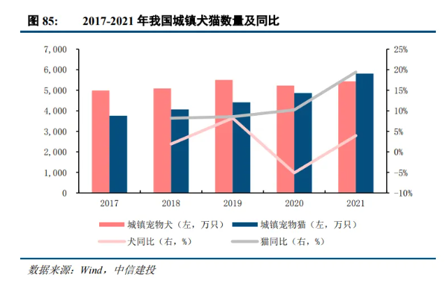 从发展空间上看,2021 年我国城镇犬猫数量同比增长 11.41%,犬猫平均单宠消费增长 9.3%,预计 2022 年宠物数量和单宠消费将保持增长,此 外,宠物“拟人化”特点不断突出,“毛孩子”观念不断渗透,宠物市场消费升级利好宠物动保发展,宠物动保 增长空间较大。