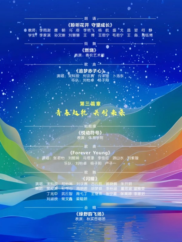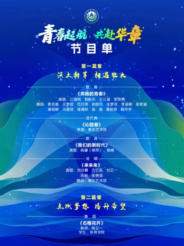 于是排练厅的窗棂又亮了 演员和工作人员 一遍又一遍练习走位 所有用心 只为说一句: “新同学 欢迎加入这关于热爱的开场” 将喜悦揉进舞蹈 灯光映着跃动的身影 裙摆旋出风的形状 合唱团反复调试着 那句“欢迎同学们”的声线 演出现场即将响起的掌声与欢呼 我们将以最鲜活的姿态 为你摊开农大的画卷—— 就让我们一起来看看 都有哪些不容错过的节目吧 演出时间 10月14日19:00 演出地点 河南农业大学文化路校区田径场 与此同时 “河南农业大学”视频号 将同步架起“云镜头” 让屏幕前的你我 也能触到现场的滚烫 共赴美好 1.为保证会场秩序,请自觉将手机等通讯设备置于无声状态; 2.请遵守会场秩序,如遇特殊情况,请配合听从工作人员安排; 3.禁止携带危险品、有色饮料和食物进会场; 4.场内禁止吸烟和进食食物,请注意场内清洁卫生; 5.演出现场须保持安静,请勿大声喧哗; 6.秋季夜晚温度较低,请注意添衣保暖。 10月14日19:00 田径场上 新同学 你好 农大的故事 从这场晚会开始书写! 我们 不见不散!