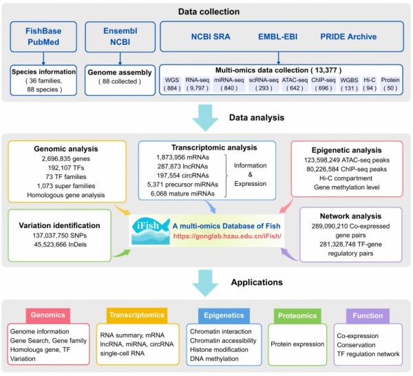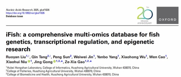 近日,华中农业大学水产学院高泽霞教授团队联合信息学院龚静教授团队在Nucleic Acids Research期刊上发表题为“iFish: a comprehensive multi-omics database for fish genetics, transcriptional regulation, and epigenetic research”的研究论文。该团队开发的“iFish”综合性鱼类多组学数据库(https://gonglab.hzau.edu.cn/iFish/),不仅整合了基因组图谱、基因表达谱、表观遗传修饰及蛋白质组数据,还实现了遗传变异、转录因子(TFs)及非编码RNA(ncRNAs)的系统鉴定。它是迄今为止系统整合、分析和存储鱼类多组学数据的最全面平台,将成为鱼类遗传学、转录调控和表观遗传学研究的重要资源。