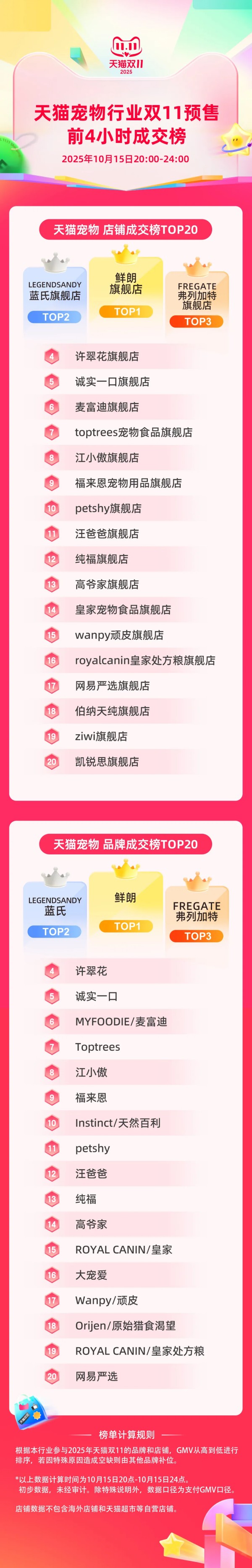 据天猫宠物行业双11预售前4小时成交榜显示(数据统计时间为2025年10月15日20:00-24:00)。