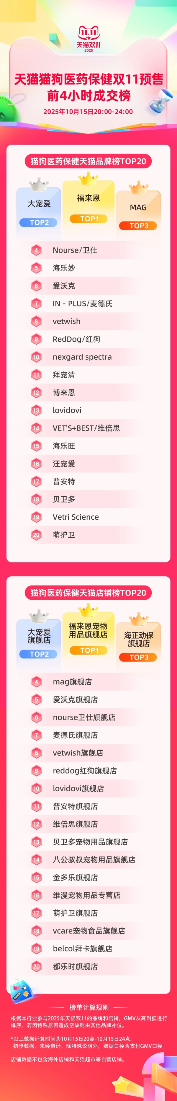 猫狗医药保健天猫店铺榜TOP10:福来恩宠物用品旗舰店、大宠爱旗舰店、海正动保旗舰店、mag旗舰店、爱沃克旗舰店、nourse卫仕旗舰店、麦德氏旗舰店、vetwish旗舰店、reddog红狗旗舰店、lovidovi旗舰店。