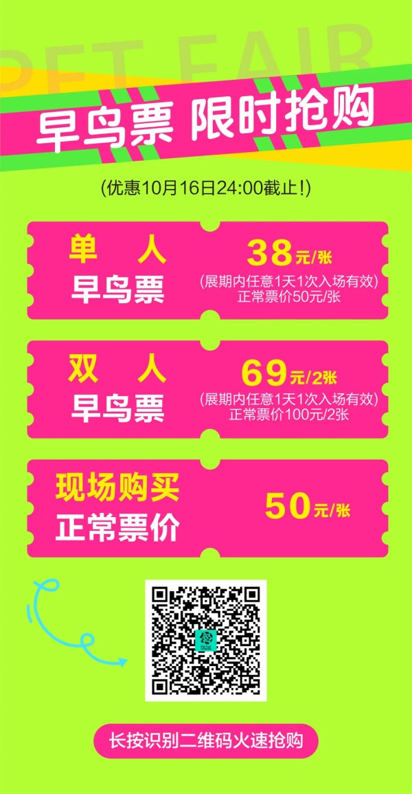 04 购买门票 宠友观众:宠物主、宠物爱好者等普通观众需购票参观。您可根据展期每日举办的不同活动,选择具体日期前来逛展,并可购买多张门票方便多日连续参观。 早鸟票优惠10月16日24:00截止! 长按识别二维码火速抢购 温馨提示: 1、每张门票仅限展期内入场有效。 2、儿童1.2米以下免票,须有一名成人陪同。 3、观众入场请携带本人身份证,儿童不作要求。 4、门票一经售出,恕不支持退换。 5、每人最多可购买5张门票。