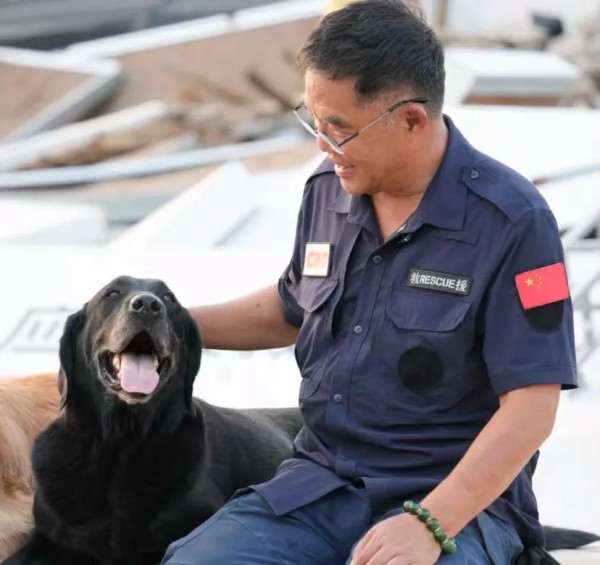 CRO应急搜救犬中心负责人钟鸣与搜救犬子歇合影