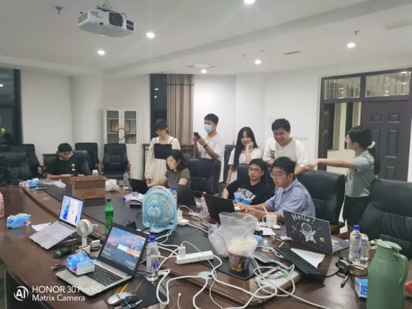团队成员在会议室备赛现场