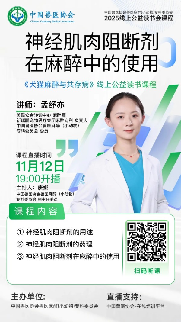线上公益读书会本次读书会分享聚焦神经肌肉阻断剂(NMBAs)在麻醉中的核心应用,将涵盖药物分类、作用机制及临床价值。同时解析该类药物药理学和肌松监测方法,结合风险防控与特殊体况动物用药注意事项,以期助力兽医麻醉医生掌握其安全规范使用要点。欢迎各位同行参与探讨!