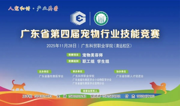 为深入贯彻落实习近平总书记对技能人才工作的重要指示精神,推动广东省宠物行业高技能人才队伍建设,广东省畜牧兽医学会正式印发《广东省第四届宠物行业技能竞赛实施方案及技术工作文件》。本届竞赛将于2025年11月28日在广东科贸职业学院(清远校区)举办,旨在通过“以赛促学、以赛促技”,为行业人才提供展示技艺、交流提升的权威平台。