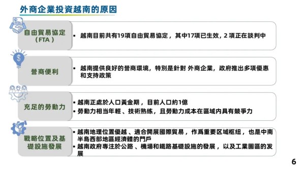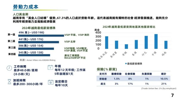 越南劳动力按区域分为四个等级,核心工业区所在的第一区,八小时工作制基础工资约200美金,且不包含加班费。“工作时间、假期制度和中国几乎一致,企业无需重新适应。”他补充道,企业与劳动者的保险分摊比例清晰,对比老挝、柬埔寨、泰国等周边国家,越南的劳动力成本优势明显,且技能水平更符合制造业需求。