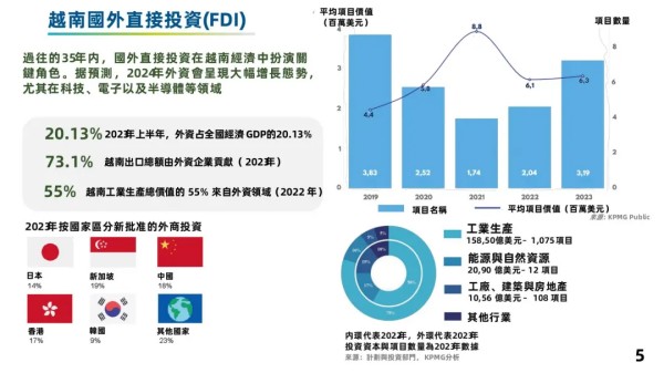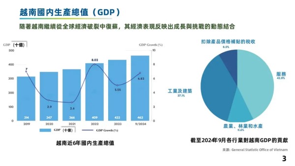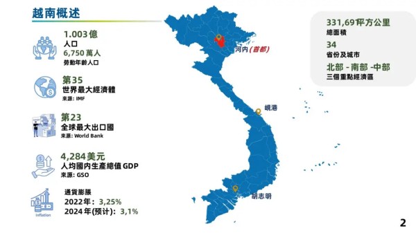 核心门路 PART \ 01 读懂宏观基本面,看清国家增长引擎 提及东南亚投资,泰国、柬埔寨常被一同提及,但张政择用一组数据给出了“越南更胜一筹”的答案。“全球投资1亿美元以上的项目,大多选择越南而非其他区域。”他展示的外资投资分布图显示,日本、新加坡、中国等主要投资国,在越南的大额投资占比持续攀升。 这种偏好并非偶然。从基础盘来看,越南1亿总人口中,6700万是劳动力,人口结构年轻且供给充足;作为全球第23大出口国,去年人均GDP达4200多美金,经济增长速度稳定在5.1%左右,与东南亚主要经济体持平。更关键的是,越南已签署多个自由贸易协定(FTA),从越南出口至全球多数国家可享受最惠国关税豁免,这对以出口为导向的宠物企业来说,是极具吸引力的政策红利。 1.人口红利正当时:近1亿人口,其中适龄劳动力约6700万,提供了一个庞大且年轻的人力池。 2. 经济持续高增长:GDP年增速稳定在5.1%左右,展现出强劲的经济活力与发展韧性。 核心门路 PART \ 02 算清微观成本账,把握利润关键点