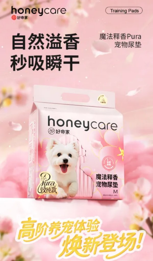 魔法释香Pura系列的诞生,源于对养宠用户调研发现“75%养宠家庭反感化学除臭剂异味”,历时2年研发出“遇水释放天然香氛+高分子物理除臭”复合技术,将“嗅觉体验”与“功能实用性”深度融合。honeycare好命家品牌曾获2024年“年度经典用品品牌大奖”、京东“匠心质造品牌奖”等荣誉,宠物尿垫持续多年稳居京东类目TOP1,全渠道宠物尿垫销售第一,全球累计服务千万+养宠家庭。
