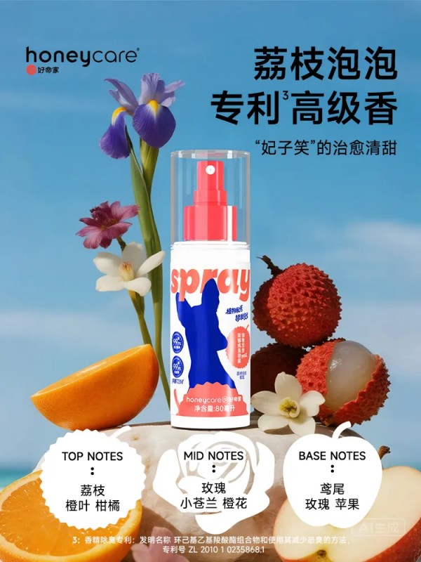 差异化亮点:以“天然植物配方+进口专利香型”切入细分赛道,区别于传统化学除螨剂,兼顾安全性与感官体验(荔枝啵啵清香提升使用愉悦感)。