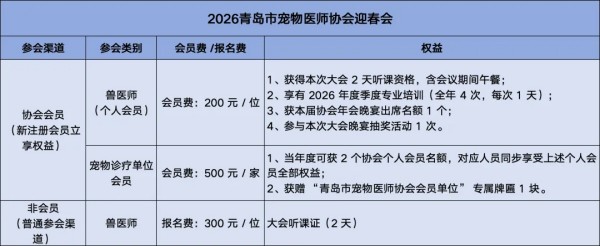 值此辞旧迎新之际,我们满怀诚挚与喜悦,特邀您出席“2026青岛市宠物医师协会迎春会”!大会将于2026年1月5日至6日在青岛东方铭悦酒店(重庆南路120号)盛大启幕,本届盛会以“燃炽火,赴盛年”为主题,既延续行业交流的核心宗旨,更注入跨国学习的全新活力。