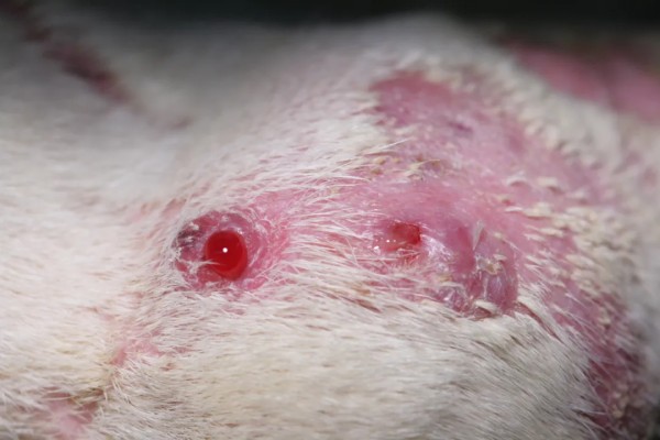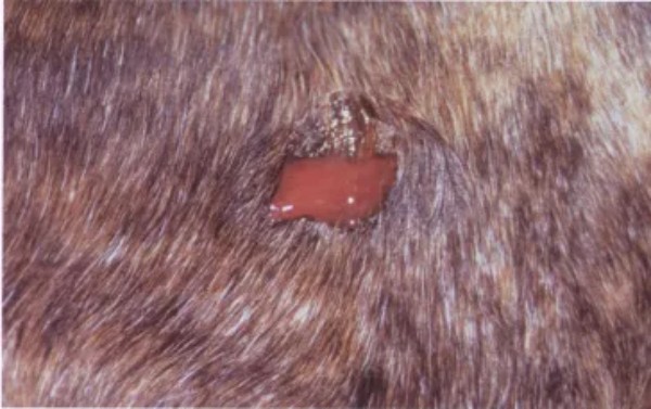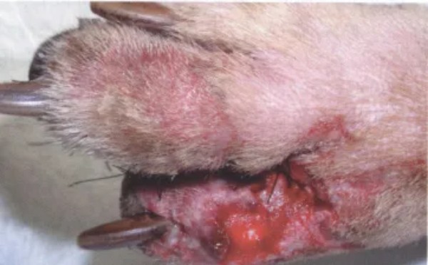 2.发病原因 潜在诱发因素包括,过敏(食物、遗传性过敏症、跳蚤叮咬)、内分泌疾病(甲状腺机能减退、肾上腺皮质机能亢进、性激素紊乱)、异物、外伤、蠕形螨、疥螨、类圆小杆线虫、自身免疫和免疫介导性疾病、免疫抑制疗法(糖皮质激素、促孕药物、细胞毒性药物)、营养不良和浅层脓皮症。 这些诱发因素进一步的继发感染,形成深部脓皮症。 3.临床症状 1.病变呈局灶性、多灶性或全身性皮肤病变。 2.表现为丘疹、脓疱、蜂窝织炎、组织脱色、脱毛、出血性大疱、糜烂、溃疡、结痂以及形成浆液性至化脓性瘘管为特征。 深层脓皮病:脓液从深层溃疡性病变和管中流出。 爪部弥散性红斑皮炎:中趾之前做了手术,继发了假单胞菌感染。注意手术部位的皮炎由条件致病菌引起 3.最常发生在躯干和受到压迫的部位。但任何部位均可发生。常见淋巴结增大。 4.如果动物发生败血症,也有发热、厌食和精神沉郁的症状。 4.诊断方法 1.细胞学(脓脓)—脓性或肉芽种性炎症,可见球菌,大量嗜中性粒细胞。淋巴细胞和巨噬细胞有时可占到视野总细胞比例的2%,提示慢性类症。对于渗出性窦道采样时可以使用湿润的无菌棉签伸入窦道内采样。 2.皮肤组织病理学—深部化脓性肉芽种性毛囊炎、疥病、蜂窝织炎和脂膜炎。可能难以找到病灶内的细菌。 3.细菌培养—常见葡萄球菌。偶可分离到假单胞菌,革兰氏阳性和阴性菌混合感染。 4.根据疾病的病史,主诉排除其他类症。 5.治疗方法 1.全身应用抗生素(至少6~8周,临床症状完全消除后再用药2周,注意即使症状消失,也不能擅自停药),临床一线用药首选头孢氨苄(乐力鲜,20~30mg/kg,PO,BID)。其他抗生素可选择头孢喹肟、头孢维星,使用时按高剂量可有助于减少抗生素的耐药性。 2.局部治疗时,长毛动物患部剃毛之后,常规外科清创。可考虑使用1:9稀释的聚维酮碘液冲洗患部深处组织。或用含有洗必泰(派奥洁)或过氧化苯甲酰(派愈托)的浴液,每2~7d药浴一次。 3.去除潜在病因。 6.预后 1.如能查明潜在性病因并去除或予以控制,预后良好。 2.如果停用抗生素7d后复发,说明治疗期短,应再用较长时间的抗生素。 3.如果在抗生素治疗期病变未完全消除,或数周至数月复发,应查找潜在病因。 4.抗生素治疗无效提示对抗生素有耐药性或为非细菌性皮肤病,应进行细菌培养和药敏试验。如果怀疑抗生素有耐药性,应提高药浴的频率(可每天洗),局部应用洗必泰溶液,并同时使用两种不同种类的高剂量抗生素,也许能达到最好的效果。 5.应用细胞学检查监测感染情况,并进行细菌培养和药敏试验,对于决定何时停止使用抗生素非常重要。 6.治疗时间不够,未能控制原发病,以及使用氟喹诺酮类抗生素均很可能会产生耐药性病原感染。 7.耐药性的产生因素包括:之前用过氟喹诺酮类抗生素、应用亚治疗剂量抗生素和使用类固醇。 8.预后良好,但在严重病例或慢性病例,可能会出现纤维化、瘢痕和斑秃等永久性后遗症。 7.参考文献 1.[美]Keith A.Hnilica[美]Adam P.Patterson,Small Animal Dermatology A Color Atlas and Therapeutic Guide Fourth Edition.