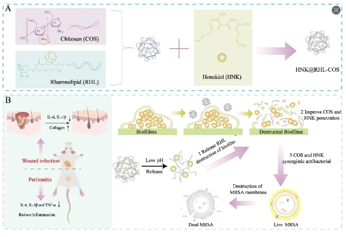 该研究针对传统抗生素难以穿透生物被膜导致疗效低下,且易诱发细菌耐药性的问题,构建了一种载天然药物和厚朴酚的鼠李糖脂修饰的壳聚糖纳米粒,该纳米粒可pH响应性释放鼠李糖脂破坏生物被膜,进而提高和厚朴酚与壳聚糖的渗透性,实现协同杀菌。该纳米粒稳定性好、安全性高、体内外抗MRSA及其生物被膜效果优异,无需依赖抗生素,就能精准靶向根除MRSA及其生物被膜。该研究为临床治疗顽固性MRSA感染提供了安全有效的新策略。