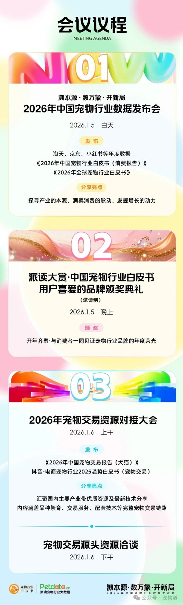而也恰是这份对源头的坚守,引领着我们走向2026。2026年1月5日—6日,我们将于宿州丰大国际酒店,带来由宿州市人民政府指导、宠物行业白皮书,派读宠物行业大数据平台主办、安徽省宠物行业协会,宿州市宠物经济商会联合主办、华南农业大学动物科学学院,赣南创新与转化医学研究院,全球宠业出海洞察协办、宿州市经济技术开发区,北京派读科技有限公司承办的全面升维的2026中国宠物行业数据发布会。