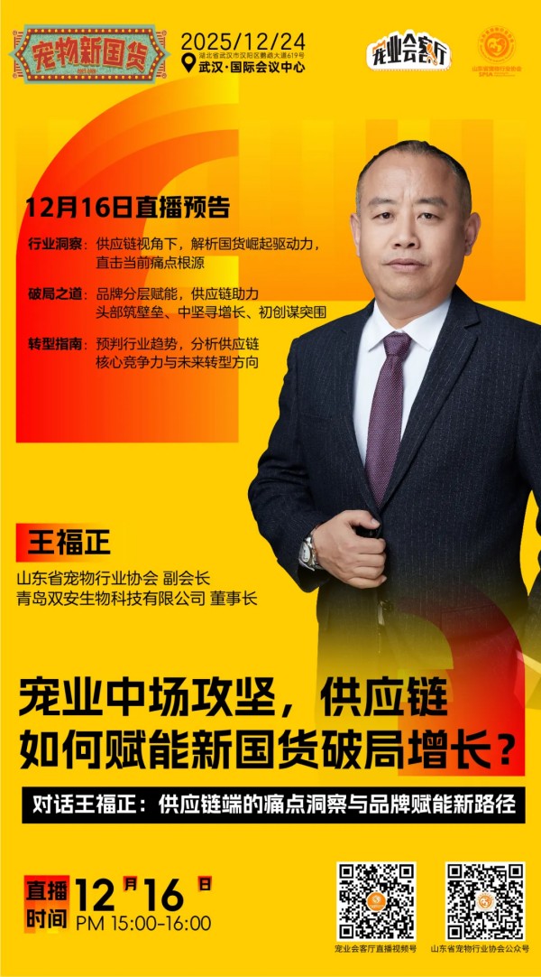 由山东省宠物行业协会打造的“宠业会客厅”系列直播将于12月16日(周二)下午3:00迎来新一期内容。国货崛起浪潮下,宠业已迈入 “中场” 攻坚期。品牌竞争从 “增量” 转向 “提质”,而供应链作为品牌增长的核心命脉,正成为决定胜负的关键变量。不同层级品牌的供应链痛点根源何在?破局路径又该如何设计?面对未来行业趋势,供应链端如何转型?