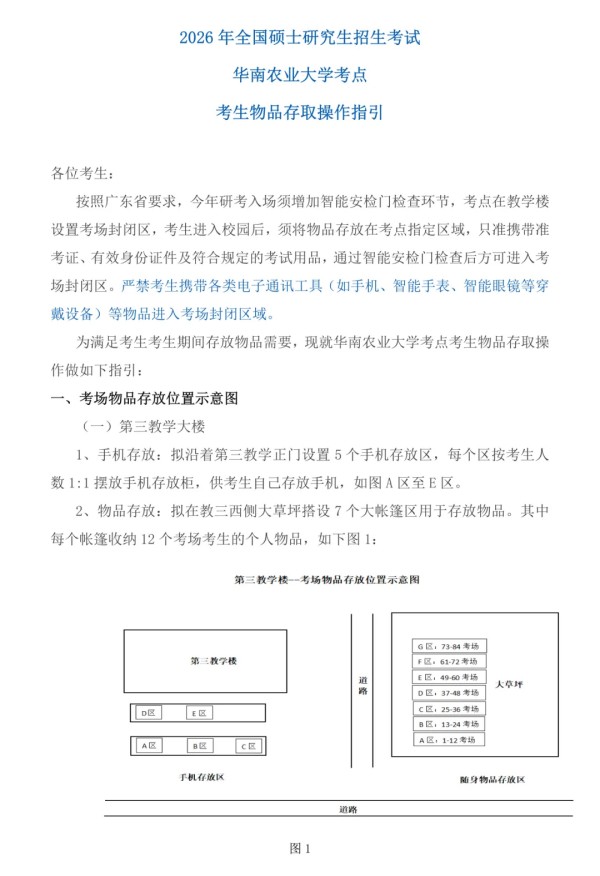 为确保2026年全国硕士研究生招生考试华南农业大学考点(以下简称“本考点”)考试安全、有序进行,根据《关于做好广东省2026年硕士研究生招生考试工作的通知》等文件精神,制订了《2026年全国硕士研究生招生考试华南农业大学考点考生赴考须知》,请本考点考生详细阅读,并按要求做好准备、准时赴考。