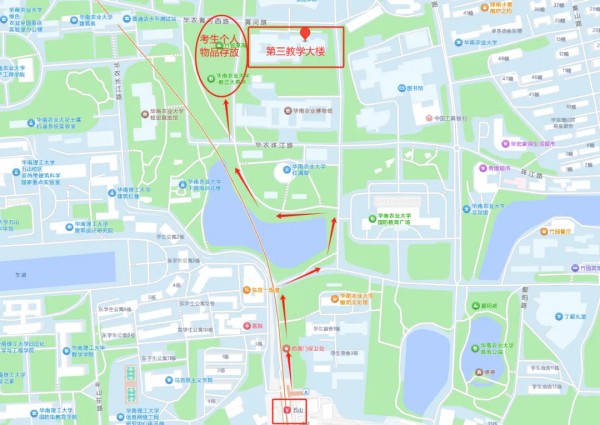 考生进校后,可由华南农大西南门(五山地铁A口)入校,沿指定路线到第三教学大楼,步行约需10分钟。见附件4.