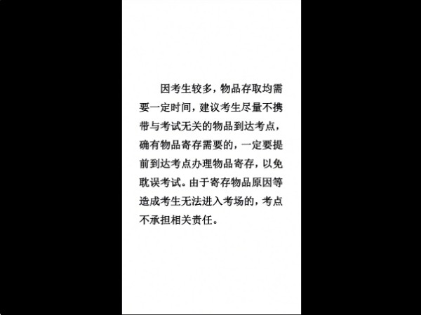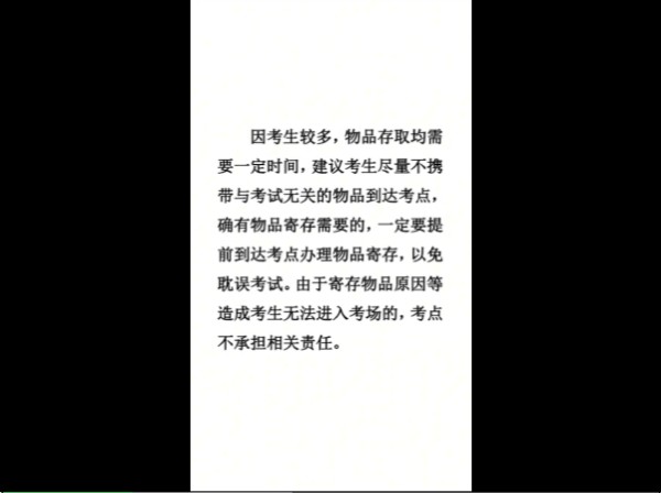 5. 特别提醒:虽然我考点为考生提供了免费物品寄存服务,但不建议考生携带贵重物品,以免丢失;由于考生较多,物品存取均需要一定时间,建议考生尽量不携带与考试无关的物品到达考点。确有物品寄存需要的,一定要提前到达考点办理物品寄存,以免耽误考试。由于寄存物品原因等造成考生无法进入考场的,考点不承担相关责任。
