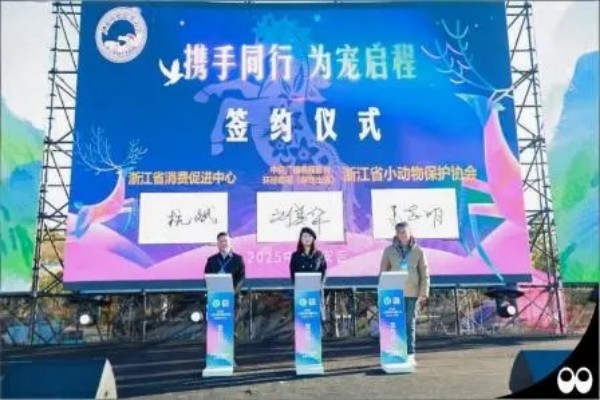 浙江省消费促进中心主任杭斌先生、中央广播电视总台环球奇观《萌宠出道》监制刘美华女士、浙江省小动物保护协会会长来志明先生分别代表各自单位,共同签约了浙江省小动物保护协会与浙江省消费促进中心通过宠物行业跨界融合促进消费的战略合作和中央广播电视总台环球奇观《萌宠出道》就联合举办“2026人宠友好(萌宠)公益春晚”的合作协议。