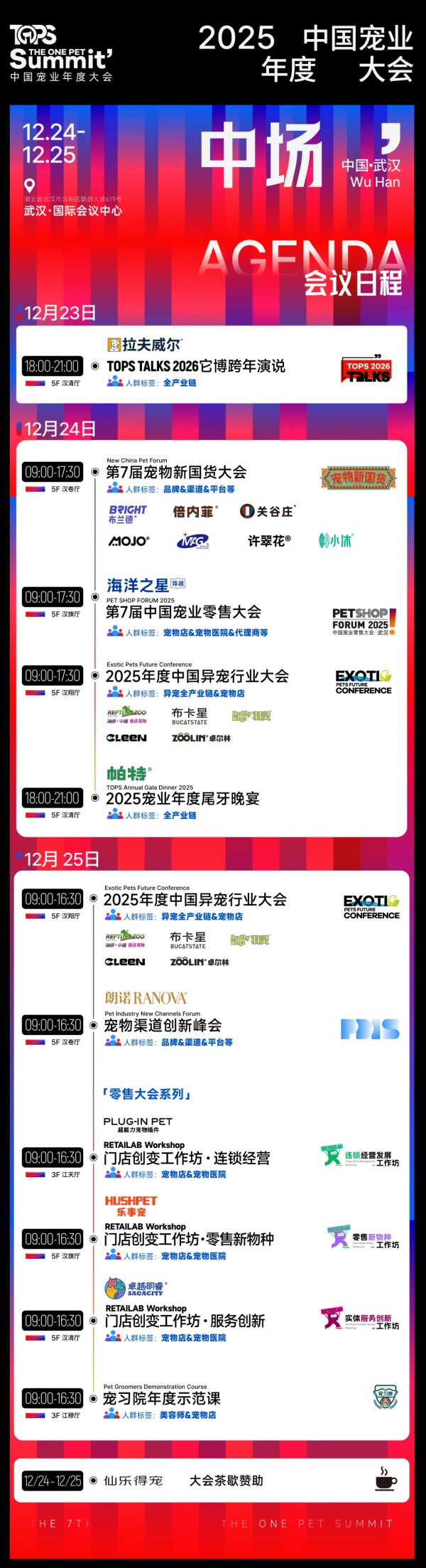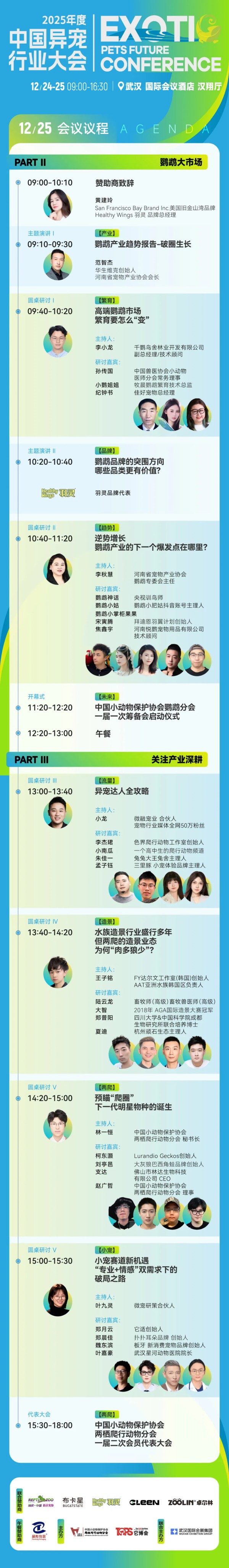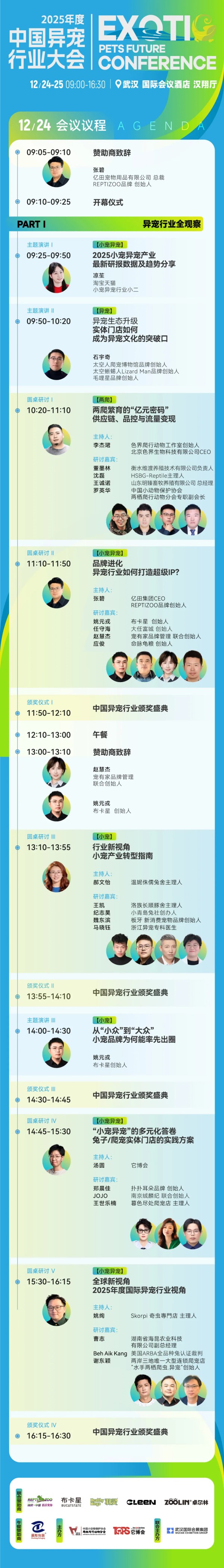 本届大会不仅延续往届专业内核,更将品类版图拓展至两爬、鹦鹉、小宠三大核心领域,更有2025年度中国异宠行业颁奖盛典、中国小动物保护协会两爬分会一届二次会员代表大会、中国小动物保护协会鹦鹉分会一届一次筹备会议,打造覆盖异宠全产业链的年度盛会。 从两爬单品类的蓝海探索,到异宠全赛道的业态布局,“2024年两爬蓝海大会(苏州)”晋升为今年的“2025年度中国异宠行业大会”,而中国异宠行业也用实际行动完成了从“小众爱好”到千亿级新赛道的跨越。 届时,众多行业顶尖专家与头部代表将出席会议,为异宠行业发展谋篇布局。在此,感谢“Reptizoo瑞皮、布卡星、羽灵、CLEEN其鳞、ZOOLIN卓尔林”作为联合冠名赞助品牌,感谢“展彤包装”作为午餐赞助商,助力行业高质量发展。 2025中国异宠行业大会 12月24日议程 2025中国异宠行业大会 12月25日议程