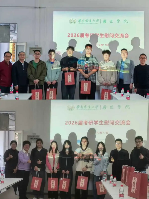 为鼓舞考研学子士气,缓解备考压力,12月17日中午,兽医学院于华山区2栋党员活动室举办2026届考研学生慰问交流会。学院党委书记戴雪飞、党委副书记陈晓梅、副院长(主持工作)孙坚、班主任代表石达友、曹伟胜、罗均、辅导员肖田园、李坤阳、2025届本校考研生代表张鑫鑫、陈婧儿以及考研学生代表参加了本次会议,围绕备考策略、心态调整、院校选择等议题展开深度交流,为冲刺阶段的考生注入强心剂。