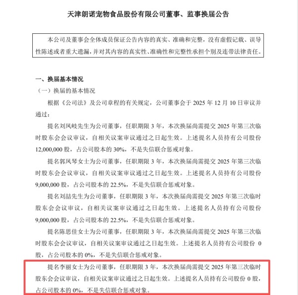 近日,天津朗诺宠物食品股份有限公司发布董事、监事换届公告,提名李丽女士为公司董事,任职期限3年,本次换届尚需提交2025年第三次临时股东会会议审议,自相关议案审议通过之日起生效。