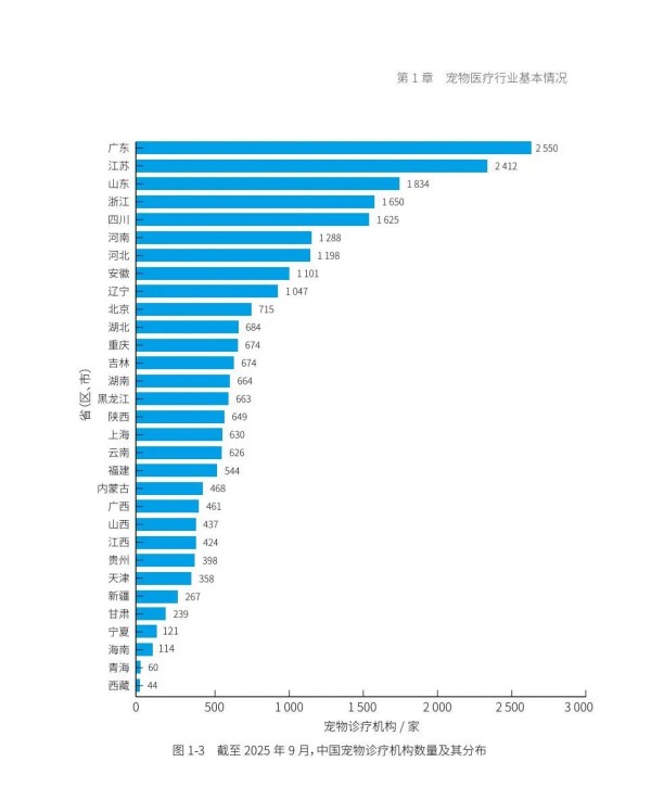 截至2025年10月,全国备案有效的动物诊疗机构数量达24619家,广东最多,达2550家,其次是江苏,达2412家,山东、四川、浙江、河南、河北、安徽、辽宁的宠物诊疗机构数量超过1000家。