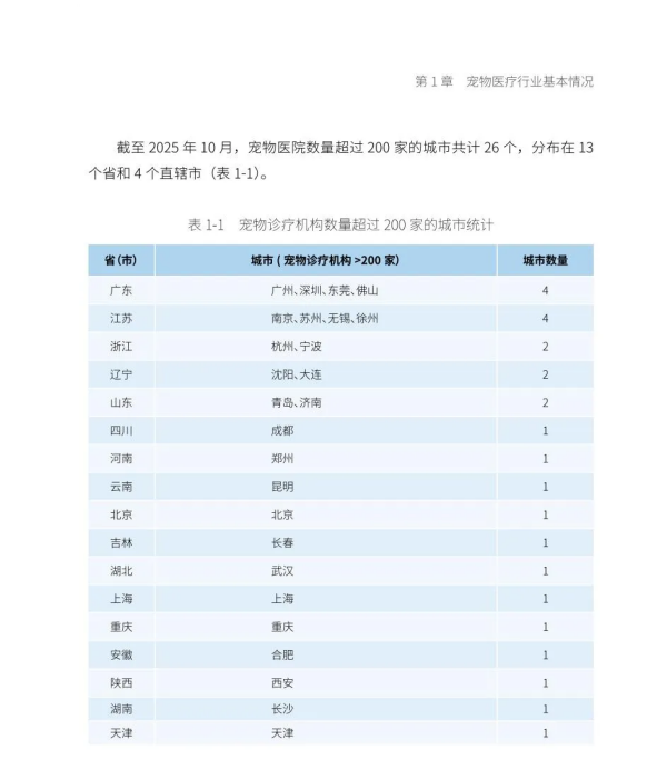 全国宠物诊疗机构数量超过200家的城市共有25个,分布在13个省和4个直辖市。