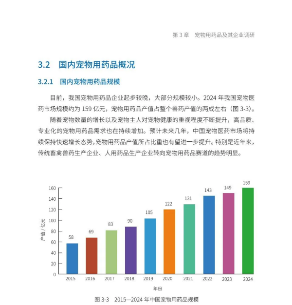 我国宠物药品企业起步较晚,大部分企业规模较小,宠物医药产值约占整个兽药产值两成左右,2024年,宠物医药产值达159亿。