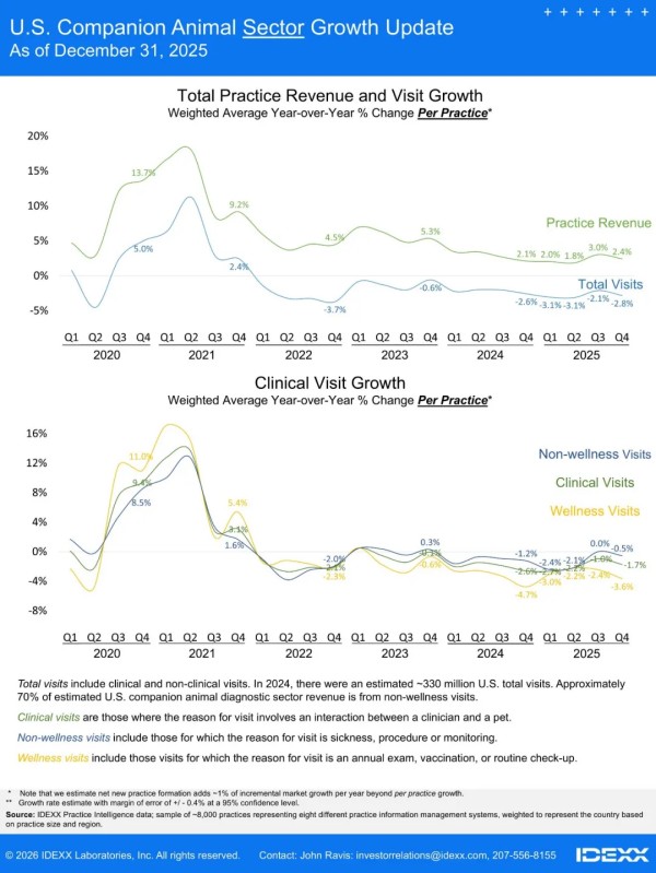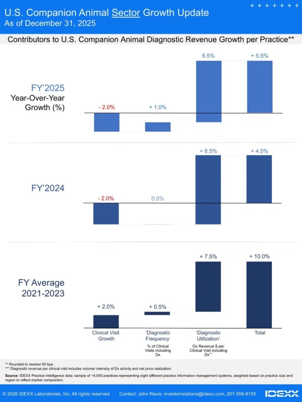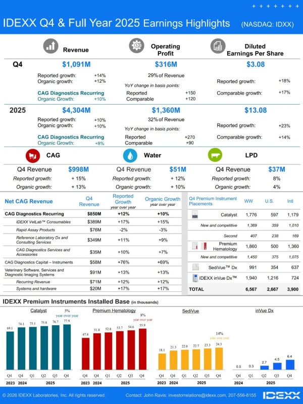 2025年第四季度营收同比增长14%(按报告数据计算)和12%(按有机增长计算),主要得益于伴侣动物诊断业务(CAG Diagnostics )强劲的经常性收入增长,其中CAG Diagnostics的经常性收入增长12%(按报告数据计算)和10%(按有机增长计算)。