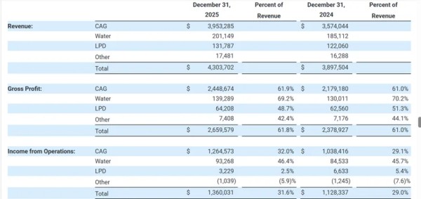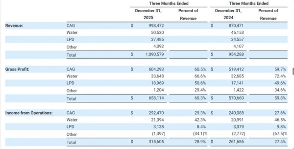 公司公布2025年第四季度营收为10.91亿美元,较上年同期增长14%(按报告数据计算)和12%(按有机增长计算),主要得益于伴侣动物业务组合(“CAG”)营收增长15%(按报告数据计算)和13%(按有机增长计算),2025年第四季度来自伴侣动物业务组合的收入为9.98亿美元,水务业务营收增长12%(按报告数据计算)和10%(按有机增长计算)。