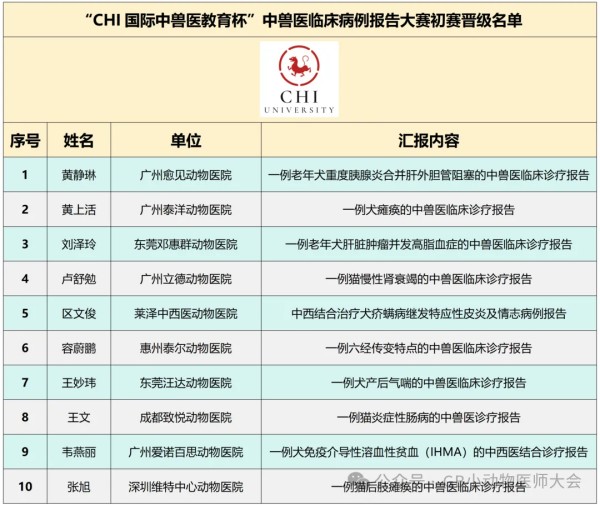 “CHI国际中兽医教育杯”中兽医临床病例报告大赛决赛名单公布&技术文件第三届大湾区小动物医师大会专科病例报告赛事项目——“CHI国际中兽医教育杯”中兽医临床病例报告大赛初赛已于2026年3月11日顺利举行。本次大赛共收到来自全国各地众多兽医师提交的精彩病例报告,经过评审专家的严格筛选与综合评定,最终有10名优秀选手脱颖而出,成功晋级决赛。本次临床病例报告大赛获得了CHI国际教育单位的大力支持,在此表示衷心感谢!同时,我们也向所有参与初赛的选手致以诚挚的谢意,你们的积极参与让这个学术交流平台更加丰富多彩,每一份病例报告都凝聚着你们的临床智慧与辛勤付出,值得尊重和赞扬。以下是晋级决赛的选手名单:为确保决赛顺利进行,现将决赛时间、地点、比赛规则及评分标准等详情公告如下,请各位晋级选手仔细阅读并做好参赛准备。本次大赛聚焦中兽医临床实践,通过分享与交流真实病例,推动中兽医辨证论治思维与现代临床诊疗相结合。大赛旨在提升兽医在中兽医技法(如中药、针灸、推拿等)应用、病例分析与疗效追踪等方面的综合能力,促进中兽医在现代宠物医疗中的科学化、规范化发展。通过赛事交流,激发临床兽医对中兽医的学习热情与创新意识,进一步推动中西医结合在宠物健康领域的融合发展。面向全国动物医院、诊所的临床执业兽医,鼓励具备中兽医学习或实践经验的医师积极参与,参赛者以个人形式报名。形式:线上提交完整病例报告(PDF格式):参照大赛提供的《中兽医临床病例报告模板》(愈见中西医动物医院提供),提交一份本人主导完成的、涉及中兽医技法(中药、针灸、推拿等)诊疗的完整病例报告。要求:完整病例报告(含基本信息、主诉、检查、诊断、治疗 及转归、讨论等 )。评分点:逻辑性(40%)、数据完整性(30%)、方案合理性(20%)、格式(10%)。病例报告提交邮箱:1039272016@qq.com ,邮件格式为:姓名+单位+主题。晋级:参赛选手提交病例报告后,大赛评审委员组织评审,决定前10名参加决赛。比赛形式:现场病例汇报与答辩:选手以病例为基础制作PPT,进行现场汇报,内容需涵盖病例概述、辨证思路、技法选用依据、治疗过程、疗效追踪与总结反思。汇报后进入评委问答环节。决赛时间:2026年3月25日9:00-12:00