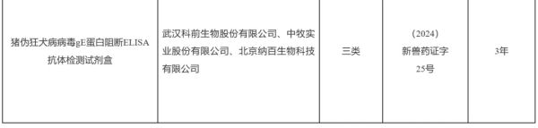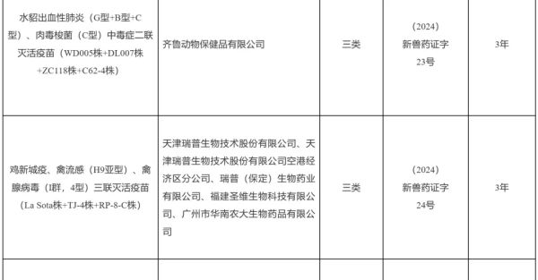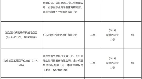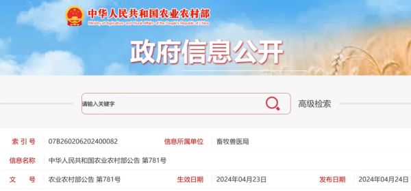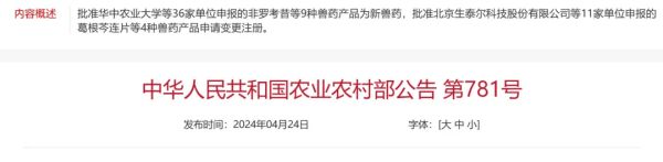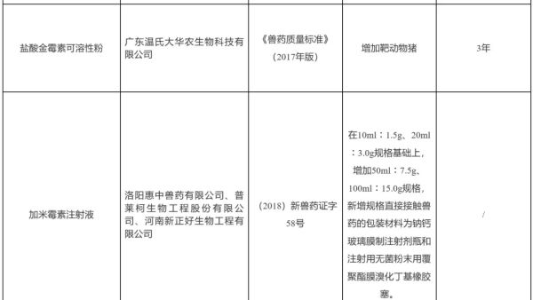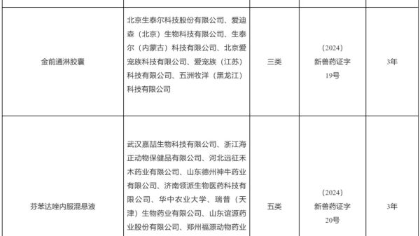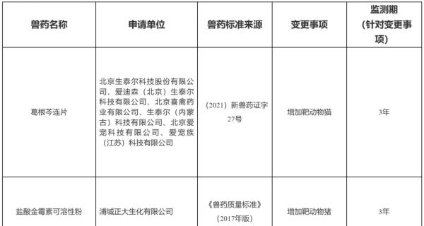 根据《兽药管理条例》和《兽药注册办法》规定,经审查,批准华中农业大学等36家单位申报的非罗考昔等9种兽药产品为新兽药,核发《新兽药注册证书》,发布产品工艺规程、质量标准、说明书和标签,自发布之日起执行。 批准北京生泰尔科技股份有限公司等6家单位申报的葛根芩连片变更注册,发布修订后的工艺规程、质量标准、说明书和标签,自发布之日起执行,此前发布的该产品工艺规程、质量标准、说明书和标签同时废止;批准浦城正大生化有限公司等2家单位申报的盐酸金霉素可溶性粉等2种兽药产品变更注册,发布修订后的说明书和标签,自发布之日起执行;批准洛阳惠中兽药有限公司等3家单位申报的加米霉素注射液变更注册,申请人按照农业农村部批准的说明书和标签自行修改并印制、使用。 特此公告。 附件: 1.新兽药注册目录 2.兽药变更注册目录 3.工艺规程 4.质量标准 5.说明书和标签 农业农村部 2024年4月23日 附件1: 新兽药注册目录 附件2: 兽药变更注册目录 附件3:(略) 附件4:(略) 附件5: 一、非罗考昔标签 兽用 【兽药名称】 通用名称:非罗考昔 英文名称:Firocoxib 汉语拼音:Feiluokaoxi 【包装规格】 【生产日期】 【生产批号】 【有效期】至 说明书和标签 【运输注意事项】 注意防潮;正面向上摆放。 【贮藏】 密闭保存 【批准文号】 【生产企业】 【包装规格】 【生产日期】 【生产批号】 【有效期】至 【运输注意事项】 注意防潮;正面向上摆放。 【贮藏】 密闭保存 【批准文号】 【生产企业】 二、非罗考昔咀嚼片说明书和标签 (一)非罗考昔原料说明书 兽用 宠物用 【兽药名称】 通用名称:非罗考昔咀嚼片 商品名称: 英文名称:Firocoxib ChewableTablets 汉语拼音:Feiluokaoxi Jujuepian 【主要成分】 非罗考昔 【性状】 本品为棕褐色刻痕片。 【药理作用】 非罗考昔是一种非甾体类抗炎药,可通过选择性抑制环氧合酶-2(COX-2)介导的 前列腺素合成,从而发挥解热、镇痛和抗炎作用。在犬体外的全血检测中,非罗考昔对COX-2的 选择性约为对COX-1选择性的380倍。 本品以原研品非罗考昔咀嚼片(Previcox)为参比制剂,在48只健康成年比格犬中进行了生 物等效性试验,结果显示与原研品非罗考昔咀嚼片具有生物等效性。 【适应证】 用于缓解犬骨关节炎及临床手术等引起的疼痛和炎症。 【用法与用量】 以非罗考昔计。内服:每1kg体重,犬5mg,每日一次。用于缓解临床手术等引 起的疼痛和炎症时,动物可在手术前约2小时开始给药,连续给药3日,可根据兽医的建议按相 同剂量继续用药。体重为3~5.5kg的犬,每次0.5片;体重为5.6~10kg的犬,每次1片;体重 为10.1~15kg 的犬,每次1.5片。 【不良反应】 1.偶见呕吐和腹泻,一般停止治疗后可恢复正常。如出现严重不良反应,应立即停止 治疗并咨询兽医。 2.与其他非甾体抗炎药相同,可能会发生严重不良反应,在十分罕见的情况下,可能是致命的。 【注意事项】 1.不得用于怀孕、哺乳期母犬。 2.不得用于10周龄以下、体重3kg以下的犬。 3.不得用于患有胃肠道出血、血液恶液质或者出血性疾病的犬;不得用于任何脱水、血容量 减少或低血压的犬。 4.不得与皮质激素类或其他非甾体类抗炎药联合使用;不得与其他潜在的具有肾脏毒性的药 物同时使用。 5.本品可单独喂食,也可与食物一同给药。 6.如果出现以下任何反应应停止治疗:反复腹泻、呕吐、粪便潜血、体重突然减轻、厌食、 嗜睡、肝肾生化指标异常等。 7.由于麻醉药物可能会影响肾脏的血流灌注,因此在手术过程中应考虑使用静脉输液,以减 少在围手术期使用本品导致的潜在肾脏并发症。 8.本品应避免与其他高血浆蛋白结合率的药物联合使用,以免发生竞争结合血浆蛋白,使游 离的药物浓度增高而出现不良反应。 9.将未使用的半片放回原包装内,最多保存7日。 10.勿超剂量使用。 11.使用本品后请洗手。 12.本品应存放于儿童无法触及处。 【休药期】 无需制定 【规格】 57mg 2 【包装】 【贮藏】 30℃以下,密封保存。 【有效期】 48个月 【批准文号】 【生产企业】 (二)非罗考昔咀嚼片标签 宠物用 【兽药名称】 通用名称:非罗考昔咀嚼片 商品名称: 英文名称:Firocoxib ChewableTablets 汉语拼音:Feiluokaoxi Jujuepian 【主要成分】 非罗考昔 【性状】 本品为棕褐色刻痕片。 【适应证】 用于缓解犬骨关节炎及临床手术等引起的疼痛和炎症。 【用法与用量】 以非罗考昔计。内服:每1kg体重,犬5mg,每日一次。用于缓解临床手术等引 起的疼痛和炎症时,动物可在手术前约2小时开始给药,连续给药3日,可根据兽医的建议按相 同剂量继续用药。体重为3~5.5kg的犬,每次0.5片;体重为5.6~10kg的犬,每次1片;体重 为10.1~15kg 的犬,每次1.5片。 【规格】 57mg 【批准文号】 【生产日期】 【生产批号】 【有效期】至 【休药期】 无需制定 【贮藏】 30℃以下,密封保存。 【包装】 【生产企业】 三、金前通淋胶囊说明书和标签 (一)金前通淋胶囊说明书 宠物用 【兽药名称】 通用名称:金前通淋胶囊 商品名称: 汉语拼音:JinqianTonglin Jiaonang 【主要成分】 广金钱草、车前草、光石韦、玉米须。 【性状】 本品为硬胶囊,内容物为棕色至棕褐色的粉末。 【功能与主治】 清热利湿,通淋。主治犬湿热下注所致的热淋,症见尿频、尿急、尿痛;尿路感 染见上述证候者。 【用法与用量】口服:一次量,每1kg体重,犬60~120mg