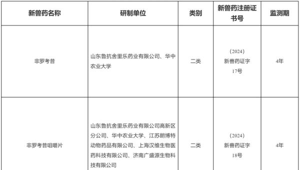 中国畜牧业协会宠物产业分会理事单位江苏朗博特动物药品有限公司、上海汉维生物医药科技有限公司、济南广盛源生物科技有限公司申报的非罗考昔咀嚼片,经农业农村部批准为新兽药并核发《新兽药注册证书》,发布产品工艺规程、质量标准、说明书和标签,自发布之日起执行。