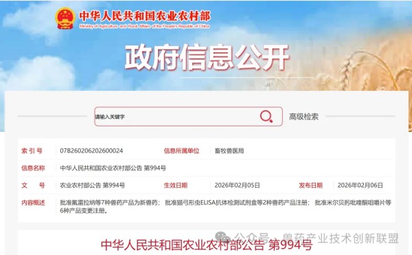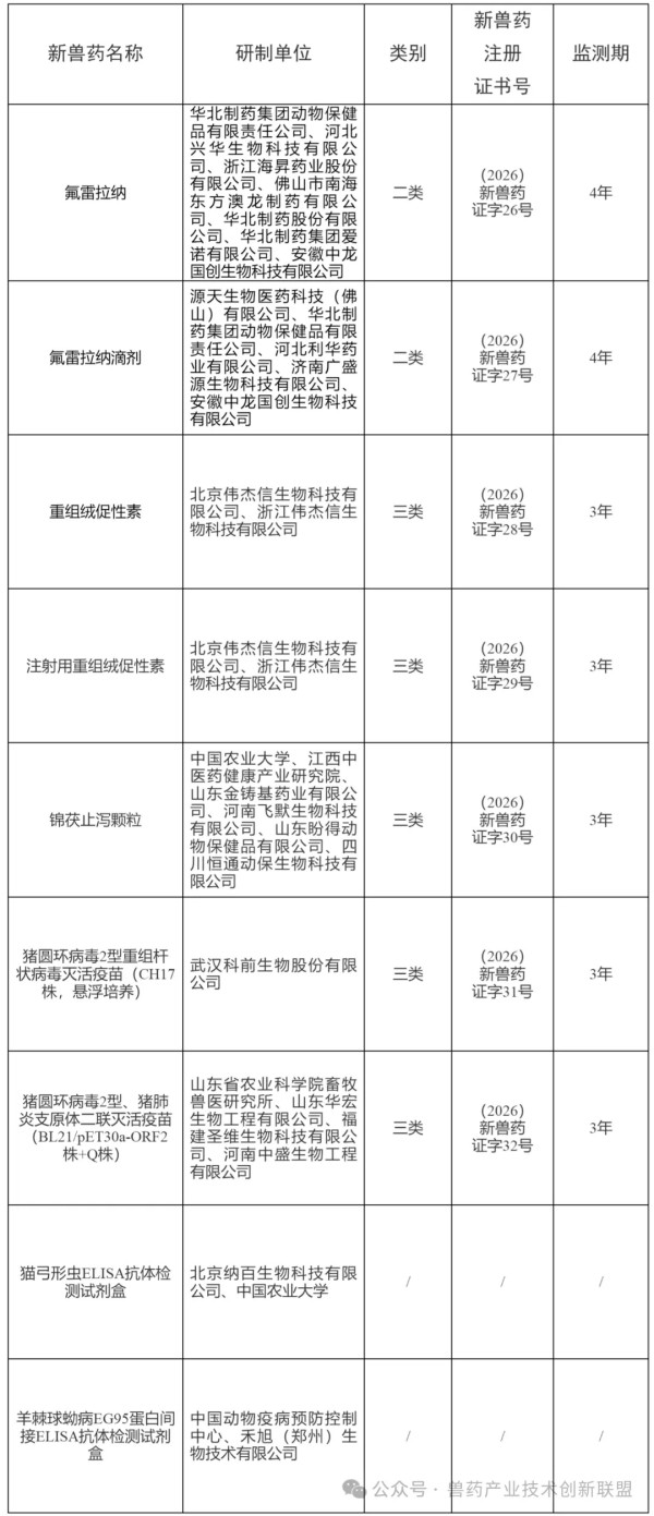 根据《兽药管理条例》和《兽药注册办法》规定,经审查,批准氟雷拉纳等7种兽药产品为新兽药,核发《新兽药注册证书》,发布产品质量标准、工艺规程、说明书和标签,自发布之日起执行。