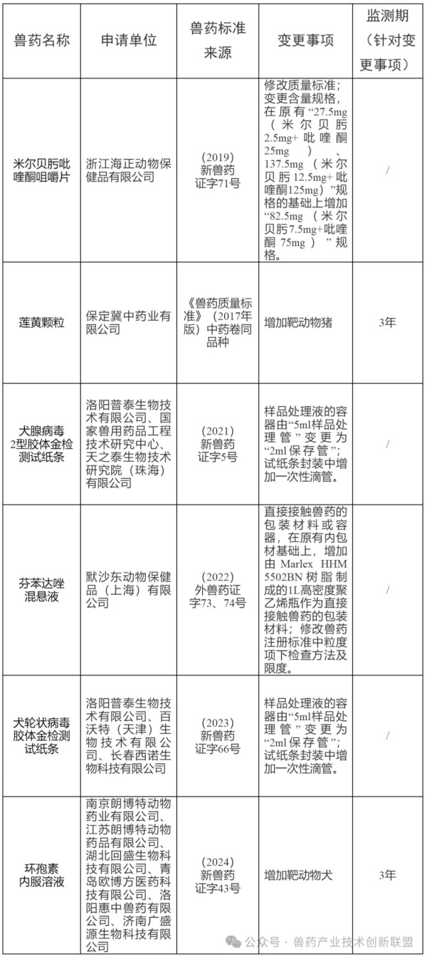 批准米尔贝肟吡喹酮咀嚼片变更注册,发布修订后的质量标准、说明书和标签,自发布之日起执行,此前发布的产品质量标准、说明书和标签同时废止;批准莲黄颗粒、环孢素内服溶液变更注册,发布修订后的说明书和标签,自发布之日起执行,此前发布的产品说明书和标签同时废止;批准芬苯达唑混悬液变更注册,发布修订后的质量标准、工艺规程,自发布之日起执行,此前发布的产品质量标准、工艺规程同时废止;批准犬腺病毒2型胶体金检测试纸条、犬轮状病毒胶体金检测试纸条变更注册,发布修订后的质量标准、工艺规程、说明书和标签,自发布之日起执行,此前发布的产品质量标准、工艺规程、说明书和标签同时废止。
